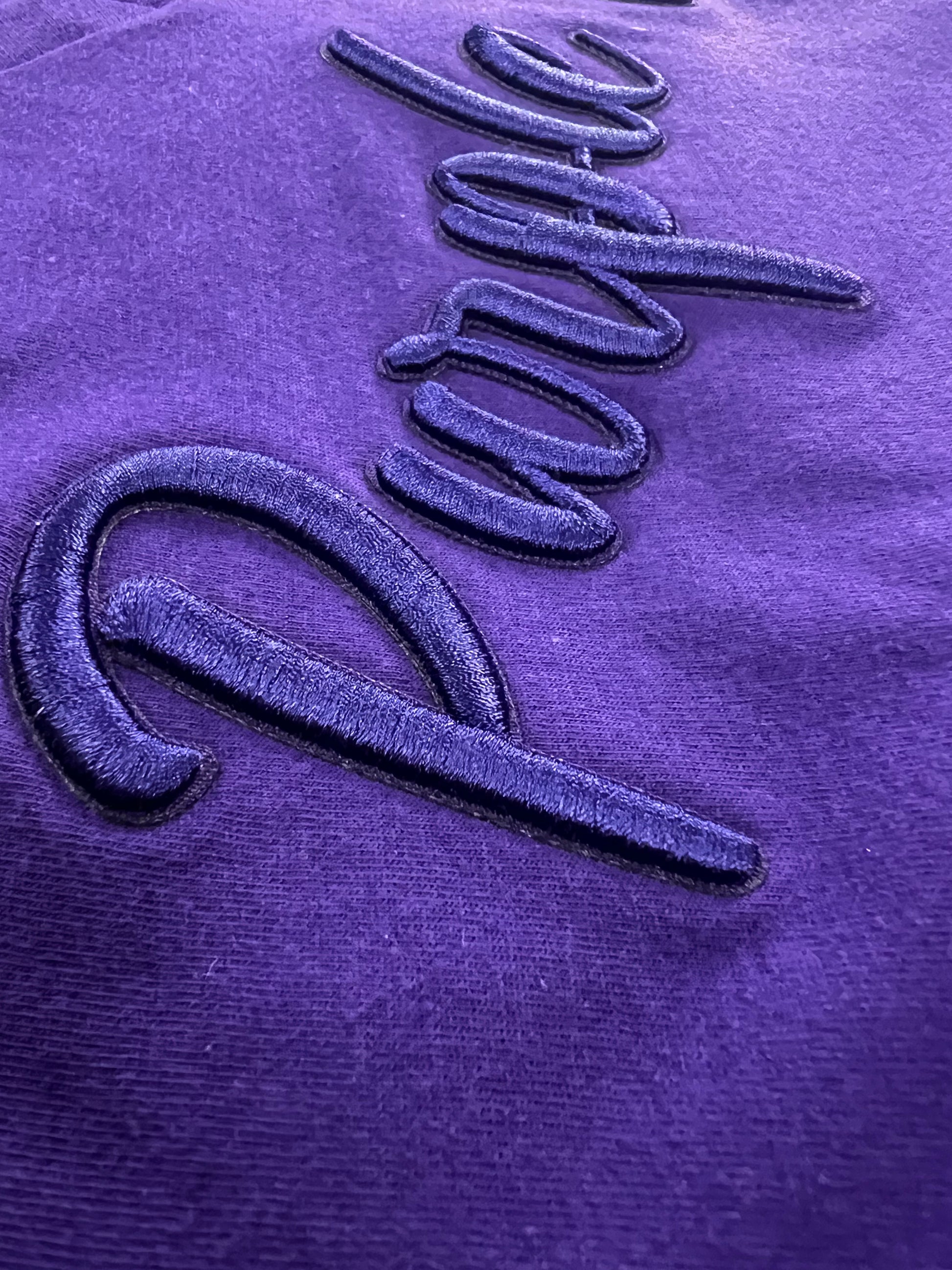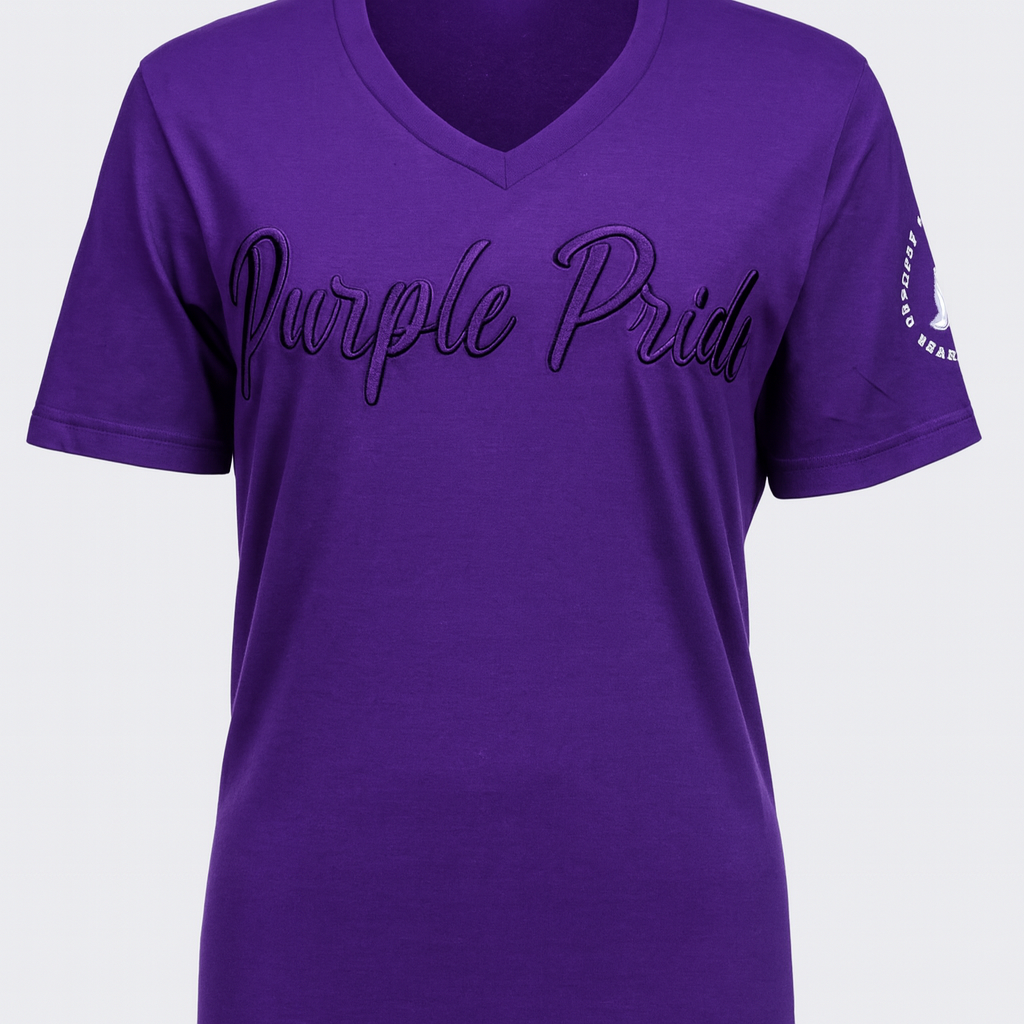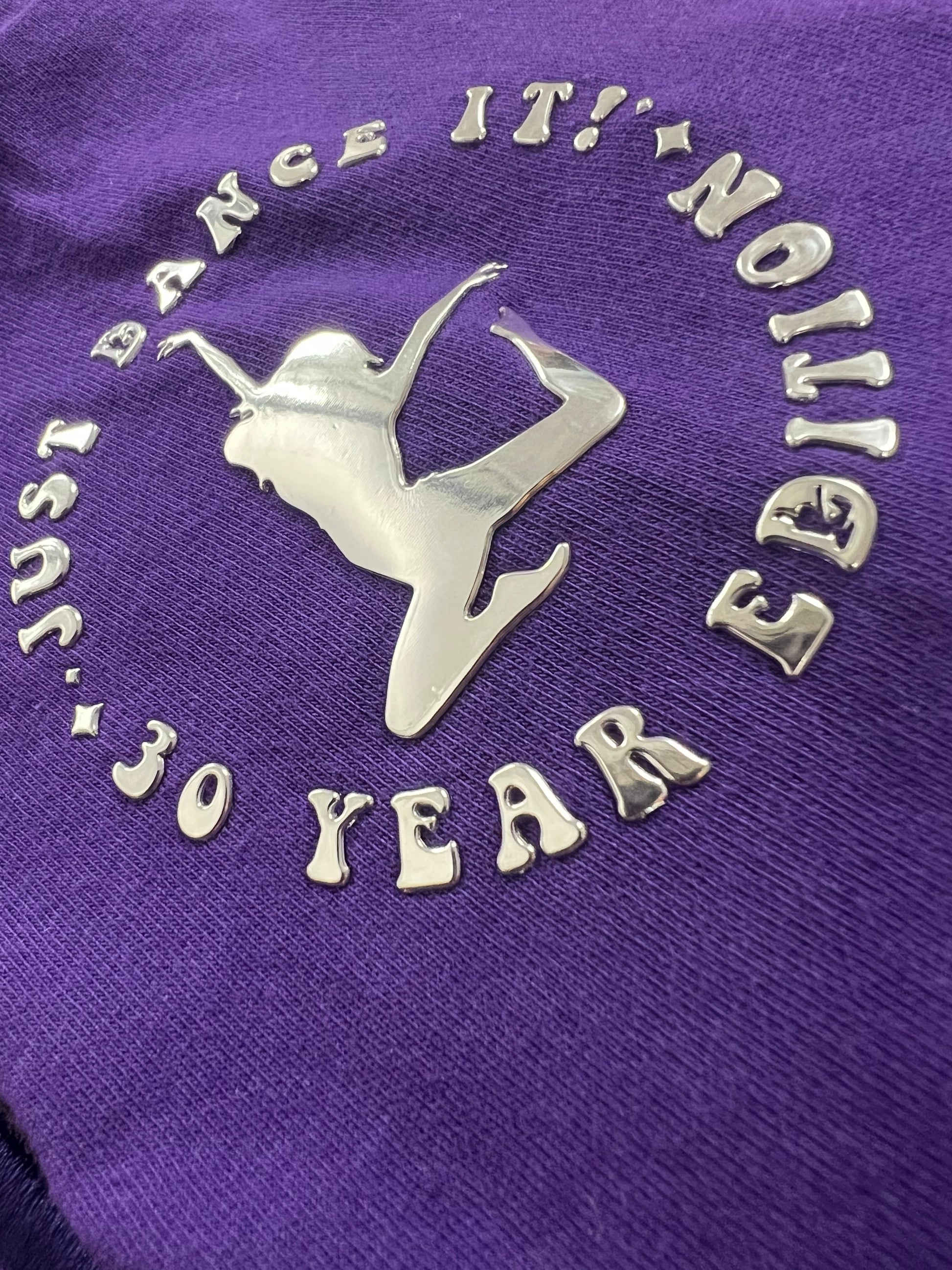 Celebrate style and legacy with the Just Dance It! 30 Year Edition Purple Pride Tee. Crafted from soft, breathable cotton, this bold purple shirt features a sleek v-neckline and embroidered "Purple Pride" lettering across the chest for a touch of elegance. The sleeve is adorned with a commemorative silver emblem reading “Just Dance It! - 30 Year Edition”, highlighting three decades of passion, movement, and community.